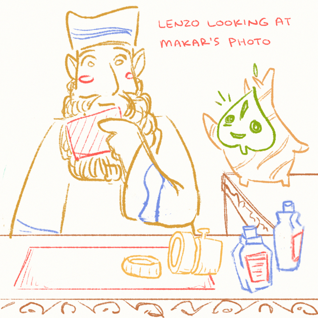 - I also wrote the first 4/5 of “The Legendary Pictographs,” a story about Lenzo (the Windfall Island photographer who recruits Link as an assistant) for the Guiding Gales Wind Waker zine. While I was working, I made a batch of silly sketches as references for the spot artist. They’re not really worth sharing, but (this one) is my favorite.